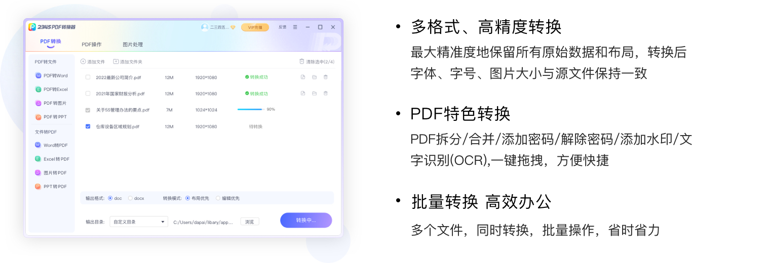 2345PDF轉換器,是一款功能強大、操作簡單的PDF轉換軟件,支持PDF文檔和Word、PPT、Excel、圖片等文檔多種格式之間的互轉;同時支持PDF拆分、PDF合并、PDF添加和解除密碼、圖片處理以及OCR文字識別等功能。文件轉換格式豐富、轉換質量好、產品界面操作便捷,是新一代文件格式轉換工具。 了解更多