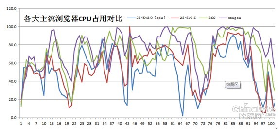 經過測試,在CPU占用方面,2345瀏覽器3.0版本占用量最少,其次為2.6版本,搜狗瀏覽器和360瀏覽器占用量基本持平。整體來看,2345瀏覽器2個版本的CPU占用量均小于其他兩款瀏覽器,能讓電腦保持穩定運行及快速處理。