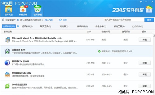 筆者了解到,2345軟件管家包含3000余款正版軟件,且在技術層面對設置了流氓捆綁的軟件進行了修正,用戶可以放心選擇安裝;同時,2345軟件管家可智能識別電腦中已經安裝的軟件,用戶只需輕輕點擊,便可完成卸載,對令用戶苦惱的卸載殘留更是提供了“強力清掃”功能,使卸載真正一步到位。