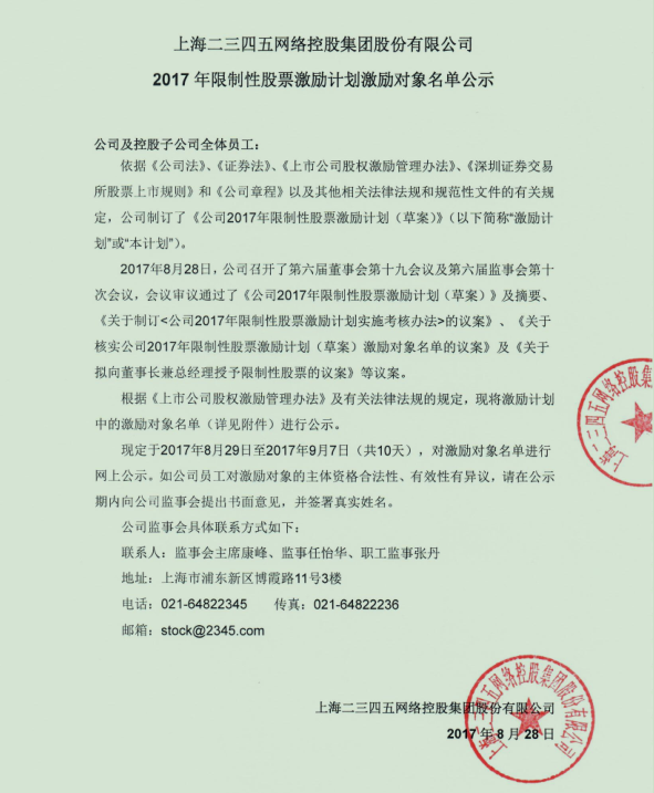 現定于2017年8月29日至2017年9月7日(共10天),對激勵對象名單進行網上公示。如公司員工對激勵對象的主體資格合法性、有效性有異議,請在公示期內向公司監事會提出書面意見,并簽署真實姓名。