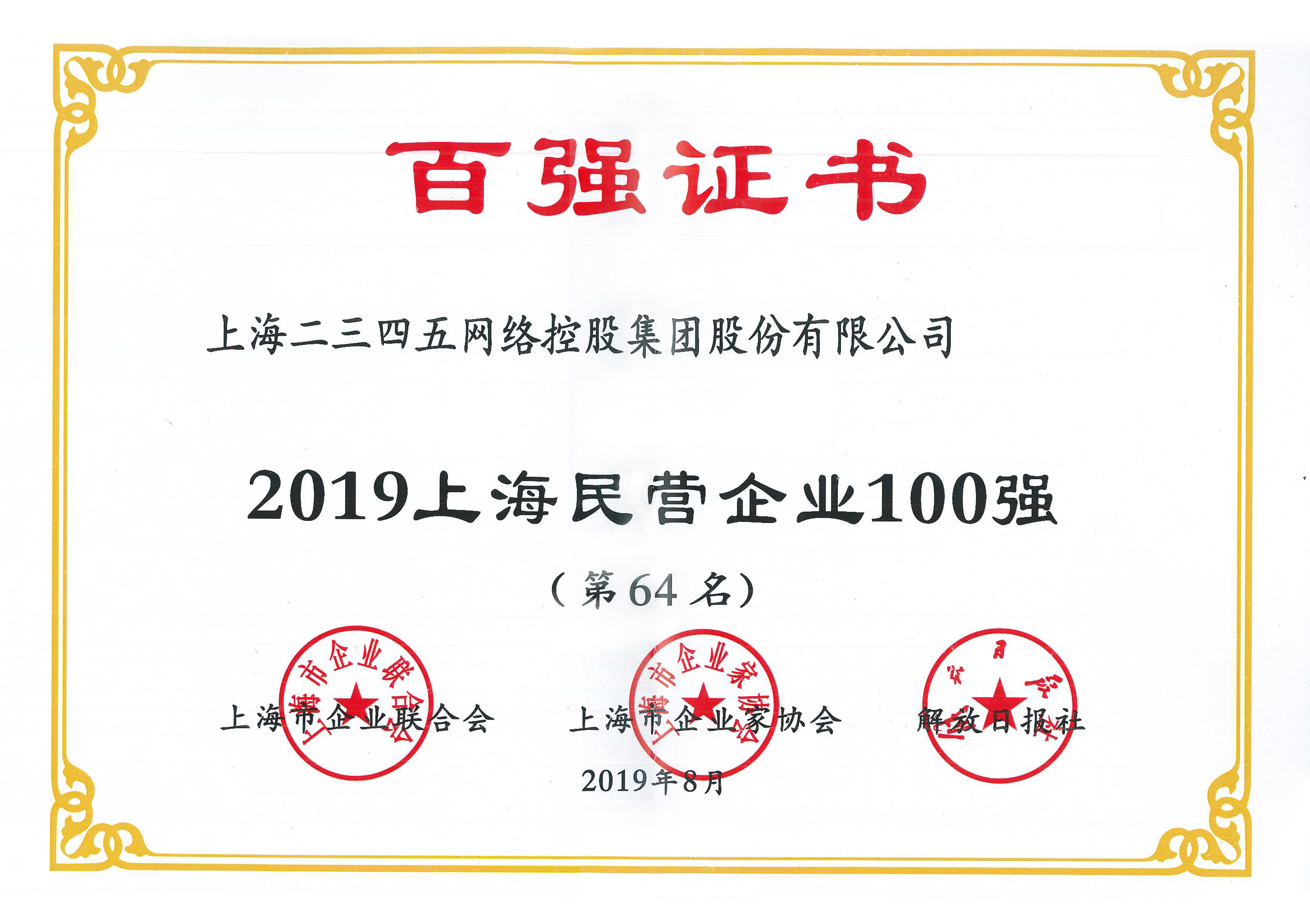 8月19日,上海市企業(yè)聯(lián)合會(huì)、上海市企業(yè)家協(xié)會(huì)、上海市經(jīng)濟(jì)團(tuán)體聯(lián)合會(huì)聯(lián)合發(fā)布2019上海百強(qiáng)企業(yè)榜單,上海二三四五網(wǎng)絡(luò)控股集團(tuán)股份有限公司(簡(jiǎn)稱“二三四五”,股票代碼002195)再次登榜,榮居上海民營(yíng)企業(yè)百強(qiáng)排行64名,較上年上升5名。二三四五還同時(shí)蟬聯(lián)上海服務(wù)業(yè)企業(yè)100強(qiáng)和上海民營(yíng)服務(wù)業(yè)企業(yè)100強(qiáng)。