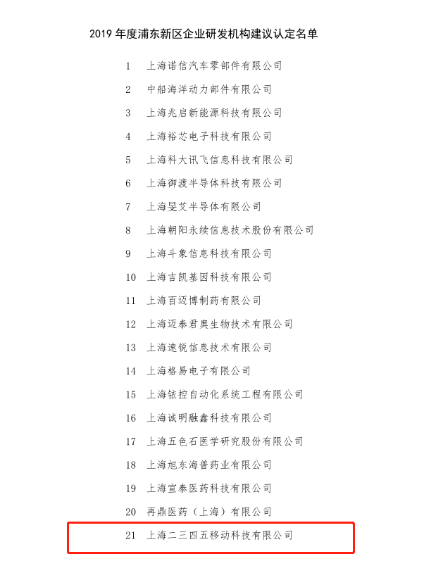 近日,上海市浦東新區(qū)科技和經(jīng)濟(jì)委員會(huì)“2019年度浦東新區(qū)企業(yè)研發(fā)機(jī)構(gòu)建議認(rèn)定名單”通過(guò)公示,經(jīng)嚴(yán)格審查,上海二三四五網(wǎng)絡(luò)控股集團(tuán)股份有限公司(簡(jiǎn)稱(chēng)“二三四五”,股票代碼002195.SZ)旗下子公司上海二三四五移動(dòng)科技有限公司被認(rèn)定為2019年度浦東新區(qū)企業(yè)研發(fā)機(jī)構(gòu),再獲政府部門(mén)肯定。