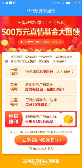 隨著國內新冠疫情逐步緩解,不少省市已經降低重大突發公共衛生事件影響等級,大力推進復工復產有序進行,讓社會經濟發展和人們生活逐步回歸正軌。2345王牌技術員聯盟恰逢9周年之際,于3月30日零點上線500萬抗疫真情基金大回饋活動,通過現金福利的活動形式,激發技術員們復工復產的工作熱情,并對疫情期間辛勤勞作的技術員進行獎勵。